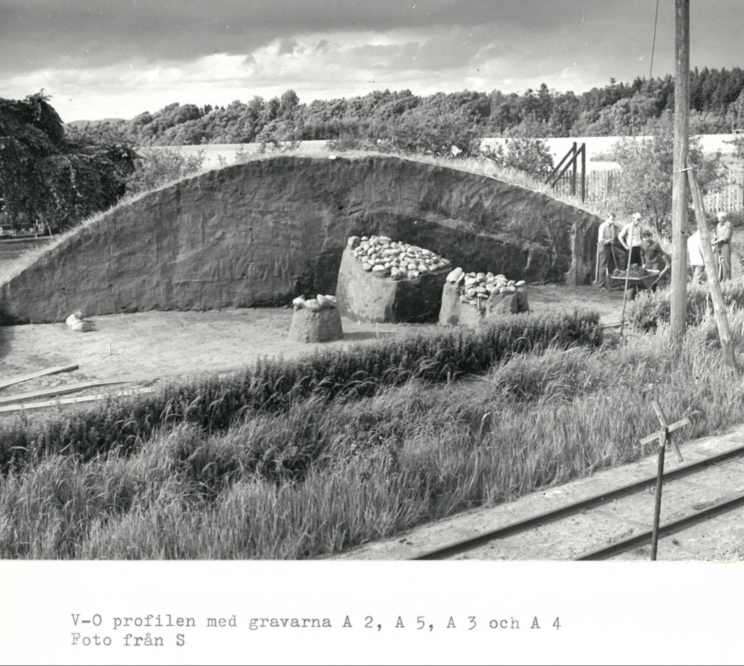 De separata gravarna består av urnor innehållande kremerade kvarlevor. De har sänkts ner i varsin så kallad stenkista i högen, och sedan täckts över.