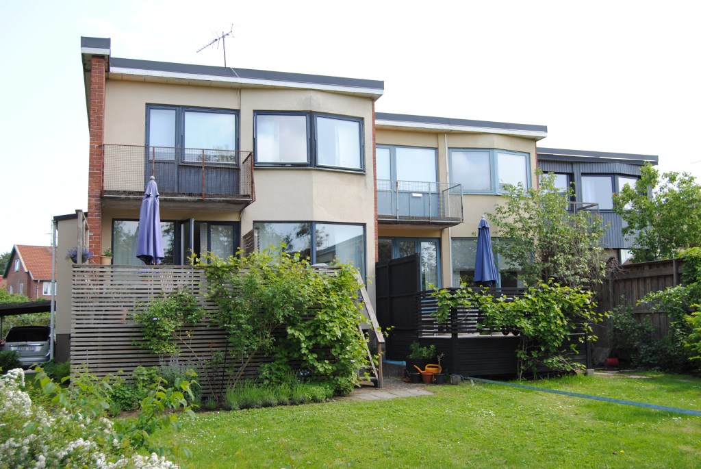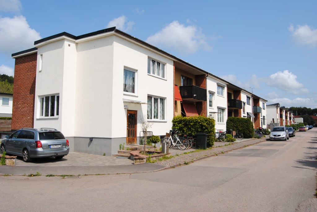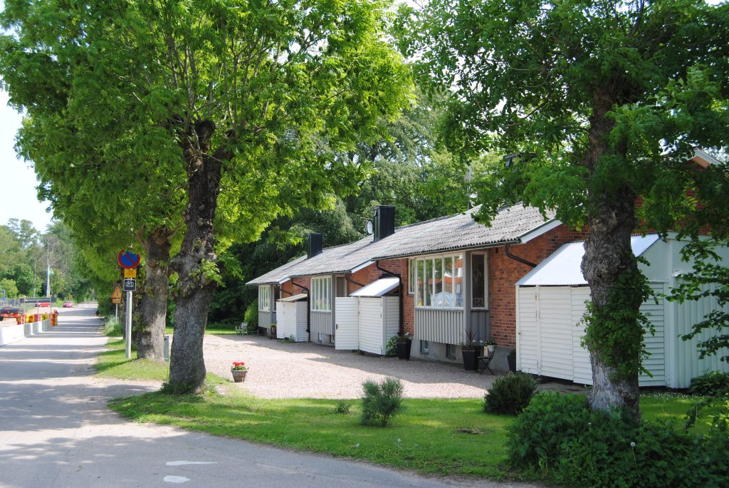 På Gymnasiegatan och Idrottsvägen finns ett radhusområde med särpräglad arkitektur som ritats av Wallberg i två etapper, 1952-56 samt 1956-58. Husen är i två våningar med källare. De har små förträdgårdar mot gatan och långsmala trädgårdar mot baksidan. Fasaderna består av puts och tegel med detaljer i trä och stål, och ges liv genom variation i kulör och arkitektur. Varannan fasad utmed Gymnasiegatan är t.ex. indragen och vänder ”framsidan” mot trädgården.