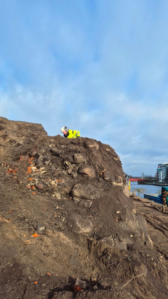 Fotot visar vår arkeolog under arbetet på Norre katt i Halmstad. Till vänster i bilden skymtas lämningar av en tegelmur som påträffats under pågående schaktningsarbete. Denna tillhör en ‘kasematt’ som ingick i Halmstads stadsbefästning under första halvan av 1600-talet.